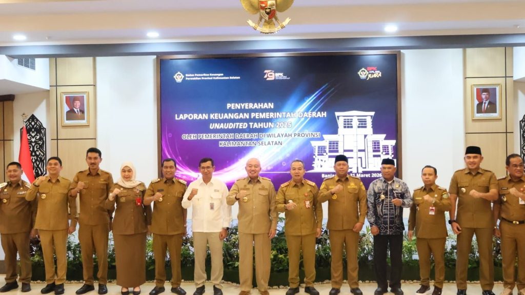 Banjarbaru – Gubernur Kalimantan Selatan H Muhidin didampingi Sekretaris Daerah Provinsi Muhammad Syarifuddin menyerahan Laporan Keuangan Pemerintah Daerah (LKPD) Unaudited tahun 2025 kepada Badan Pemeriksa Keuangan (BPK) RI Perwakilan Provinsi Kalsel, Selasa (31/03/2026) di auditorium BPK RI di Banjarbaru.