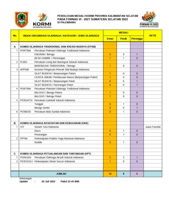 “Alhamdulillah, sampai 3 hari pelaksanaan Fornas Kalsel telah mengantongi 26 medali terdiri dari 12 medali emas, 9 medali perak, dan 5 medali perunggu,” katanya kepada tim liputan Biro Adpim Setdaprov Kalsel pada Senin (4/7).