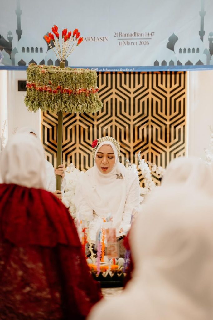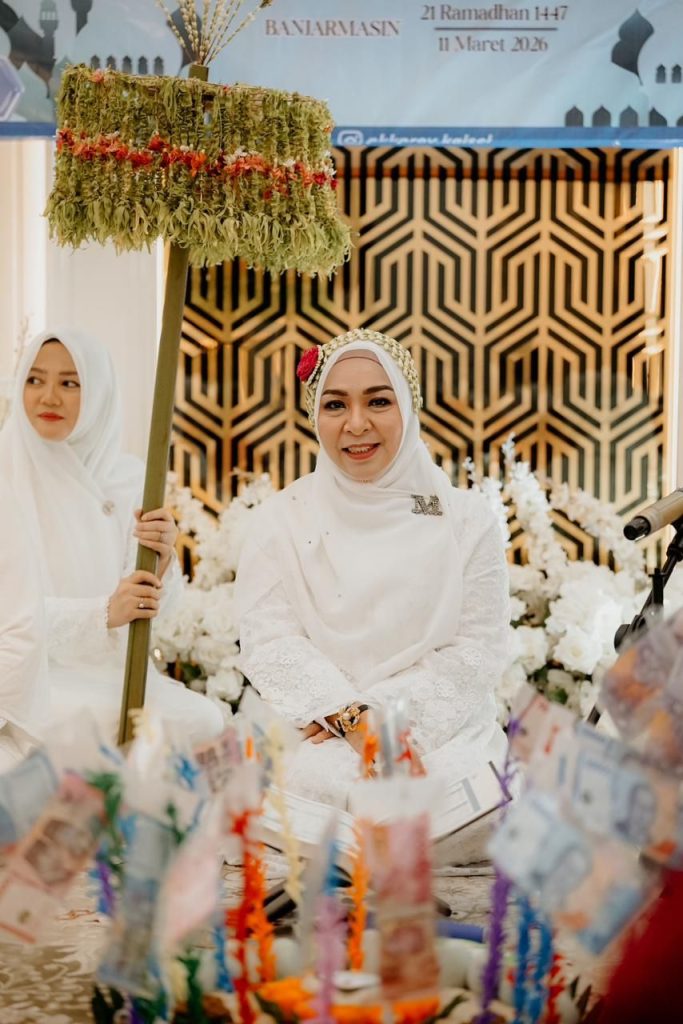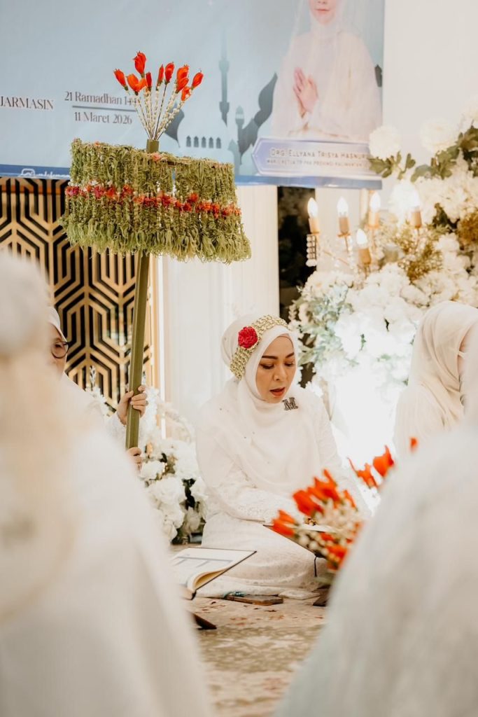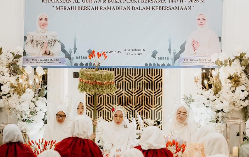 Banjarmasin – Memakai pakaian adat Banjar dan payung kembang melati serba putih, Ketua Tim Penggerak PKK Kalimantan Selatan Hj. Fathul Jannah Muhidin bersama seluruh jajaran pengurus PKK Kalsel melaksanakan kegiatan Khataman Al-Qur’an dan Buka Puasa Bersama 1447 Hijriah dengan tema “Meraih Berkah Ramadhan Dalam Kebersamaan”, di Rumah dinas Gubernur Mahligai Pancasila Banjarmasin, Rabu (11/03/2026) sore.